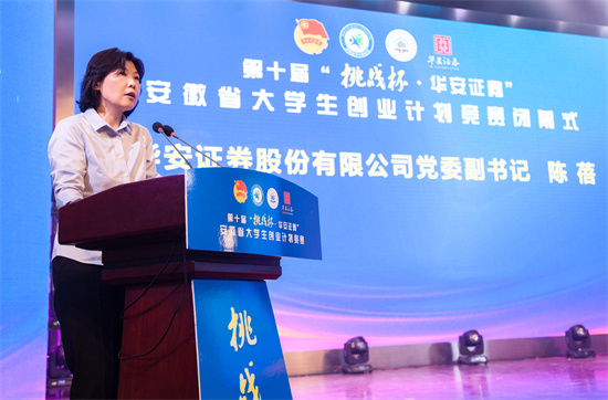华安证券党委副书记陈蓓代表大赛承办方作开场致辞。她向与会单位领导及师生对大赛的支持表示了感谢,向大赛中取得优异成绩的团体和个人表示祝贺。她指出,华安证券将责任、使命融于血脉,坚定不移服务于党的金融事业。通过发挥专业优势,凝聚服务合力,积极服务青年发展。她激励广大青年学子把大赛中收获的创业热情和经验化为继续前进的不懈动力,在实践锻炼中练就过硬本领,为加快建设现代化五大发展美好安徽贡献青春力量,以实际行动喜迎党的二十大胜利召开!